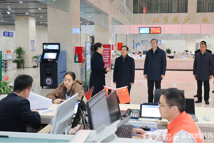 11月26日,自治区党委书记、兵团党委第一书记、第一政委陈小江在兵团第七师胡杨河市政务服务中心,了解各项工作开展情况。石榴云/新疆日报记者崔志坚摄