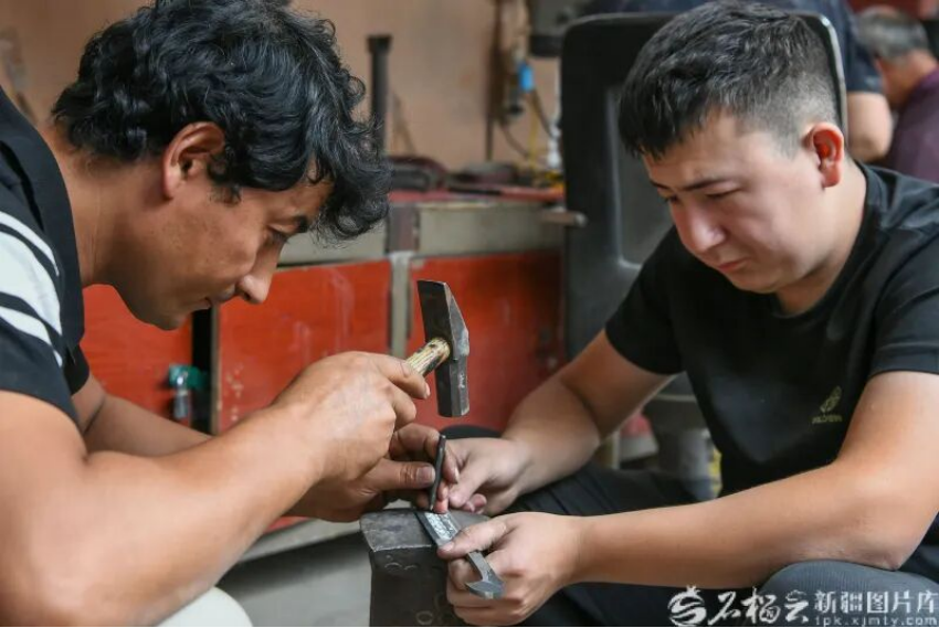 如今的小刀村焕发勃勃生机。95家刀具工坊鳞次栉比,412名工匠以锤为笔续写传奇。2023年,山东省援疆打造的非遗小镇核心项目——刀王故居落成,吸引众多传承人入驻,为传统工艺注入创新活力。目前,小刀产业链已带动610余人就业,2024年实现销售额8000万元,让非遗瑰宝真正成为乡村振兴的“金钥匙”。从古老的锻打声到现代化的展销平台,英吉沙小刀在传承与创新中不断蜕变,铺就了村民迈向幸福生活的康庄大道。