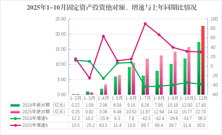 截止10月底,在库项目107个(含房地产项目15个),固定资产投资完成15.77亿元,同比增长31.4%。