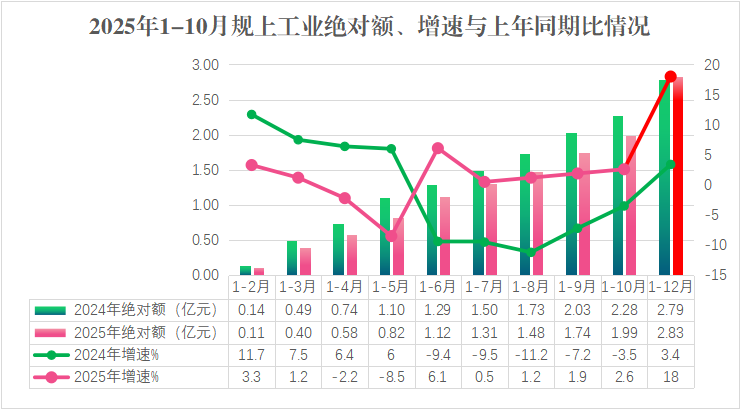 ——规模以上工业增加值预计完成1.99亿元,同比增长2.6%,增速较1-9月(1.9%)提升0.7个百分点,较上年同期(-3.5%)提高5.7个百分点。完成全年目标任务2.82亿元的70.6%。