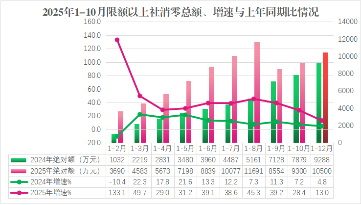限额以上社会消费品零售总额9300.3万元,同比增长28.4%。餐饮收入1609.8万元,同比增长9.2%,增速较1-9月(-0.5%)提升9.7个百分点,占限额以上社会消费品零售总额的17.3%。商品零售额7690.5万元,同比增长33.3%,占限额以上社会消费品零售总额的82.7%。