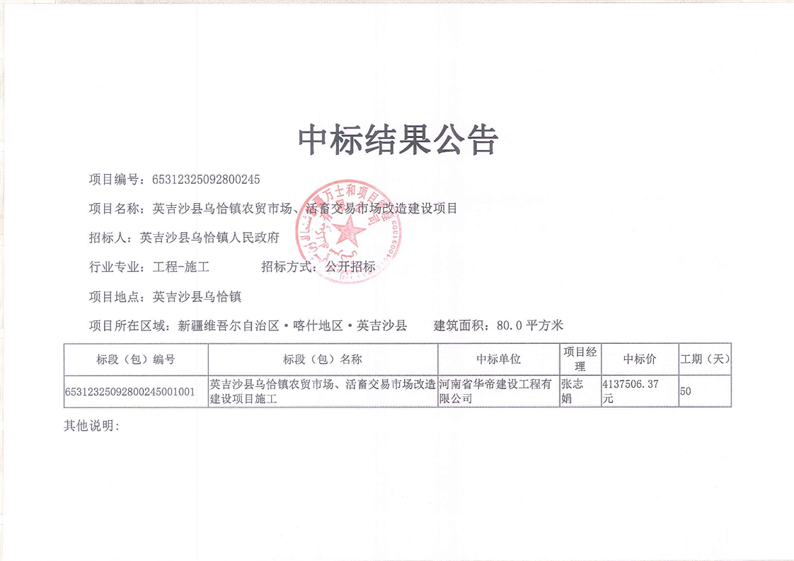 英吉沙县乌恰镇农贸市场、活畜交易市场改造建设项目施工中标公告
