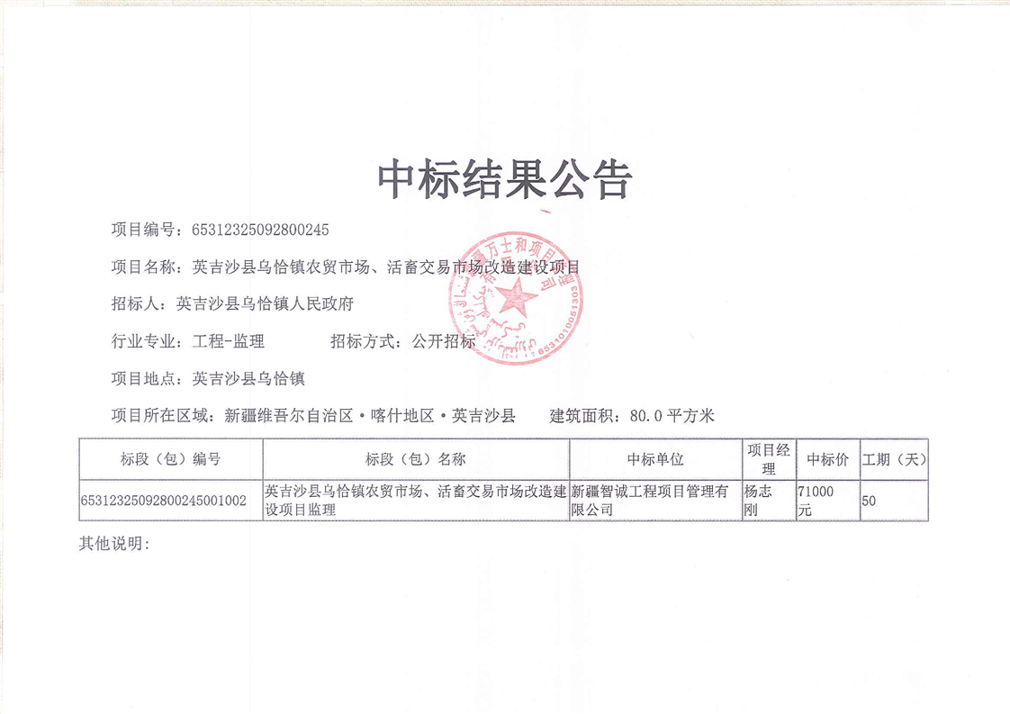 英吉沙县乌恰镇农贸市场、活畜交易市场改造建设项目监理中标公告