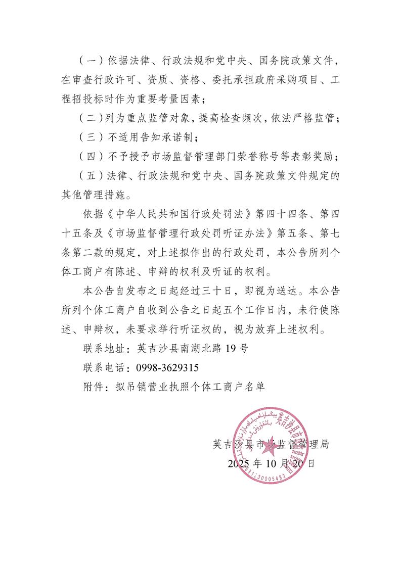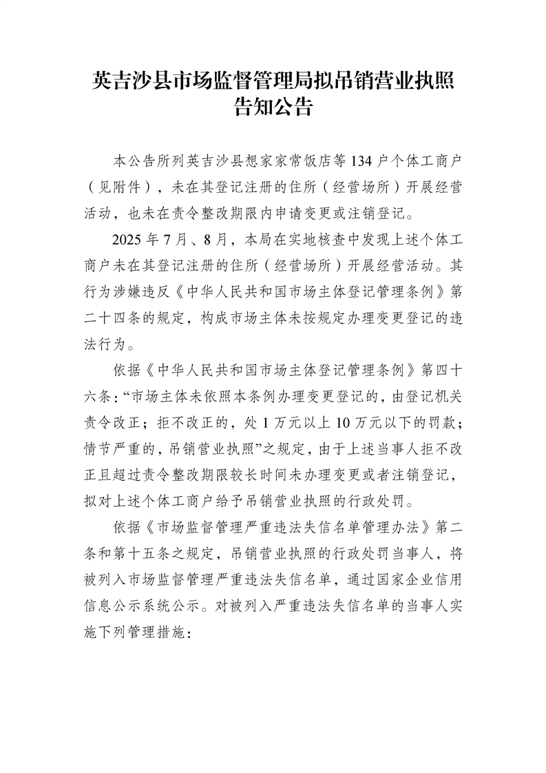 英吉沙县市场监督管理局拟吊销营业执照告知公告