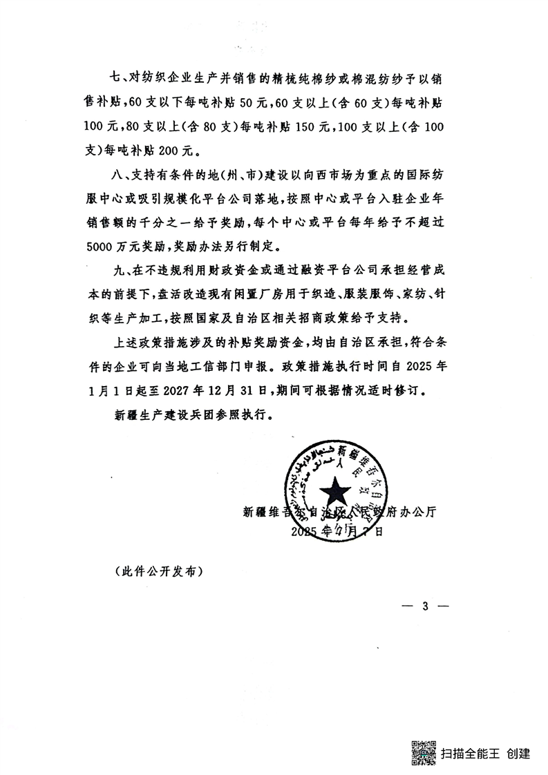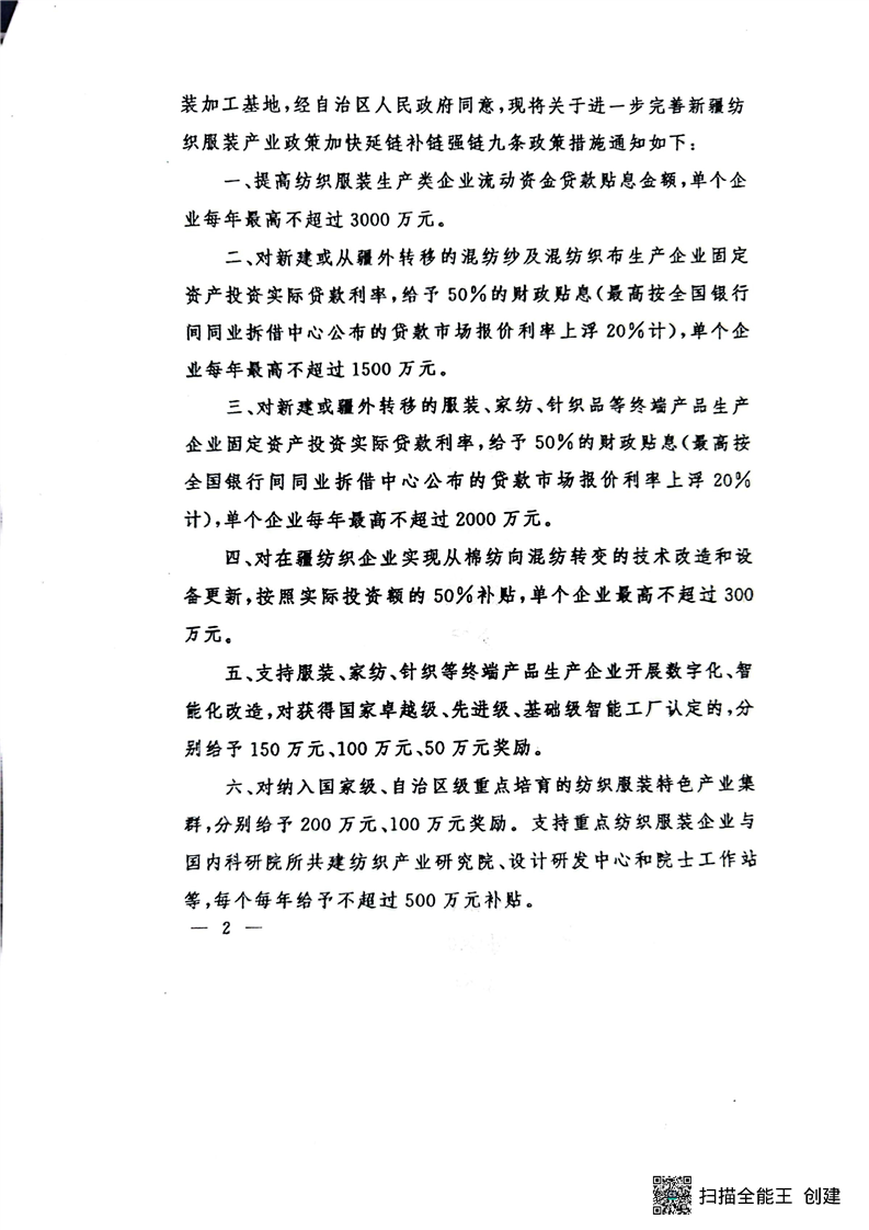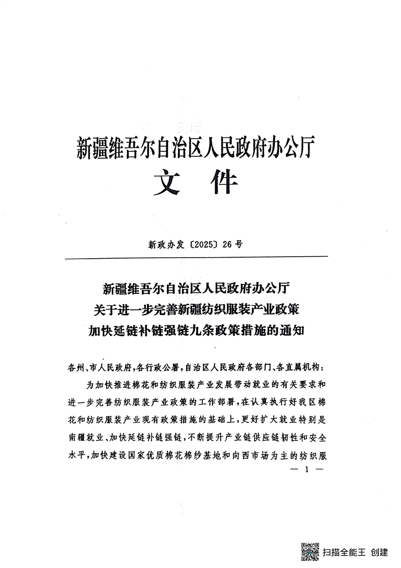 新疆维吾尔自治区人民政府办公厅关于进一步完善新疆纺织服装产业政策加快延链补链强链九条政策措施的通知